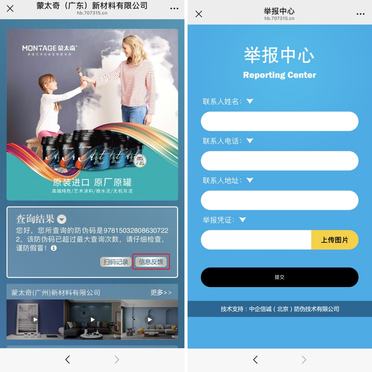 若顯示【非官方正品】,則該產品存在假冒風險,可聯系【MONTAGE蒙太奇藝術涂裝】公眾號,提供防偽碼及購買憑證進行二次核驗。