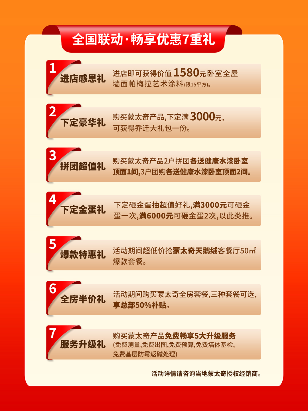 蒙太奇618年中大促作為2024年上半年第一場大型活動,遇上家裝旺季,正是沖量爆發的重要時期,為客戶帶來誠意滿滿的裝修福利,提供「進店感恩禮、下定豪華禮、拼團超值禮、下定金蛋禮、爆款特惠禮、全房半價禮、服務升級禮」等多重升級豪禮。