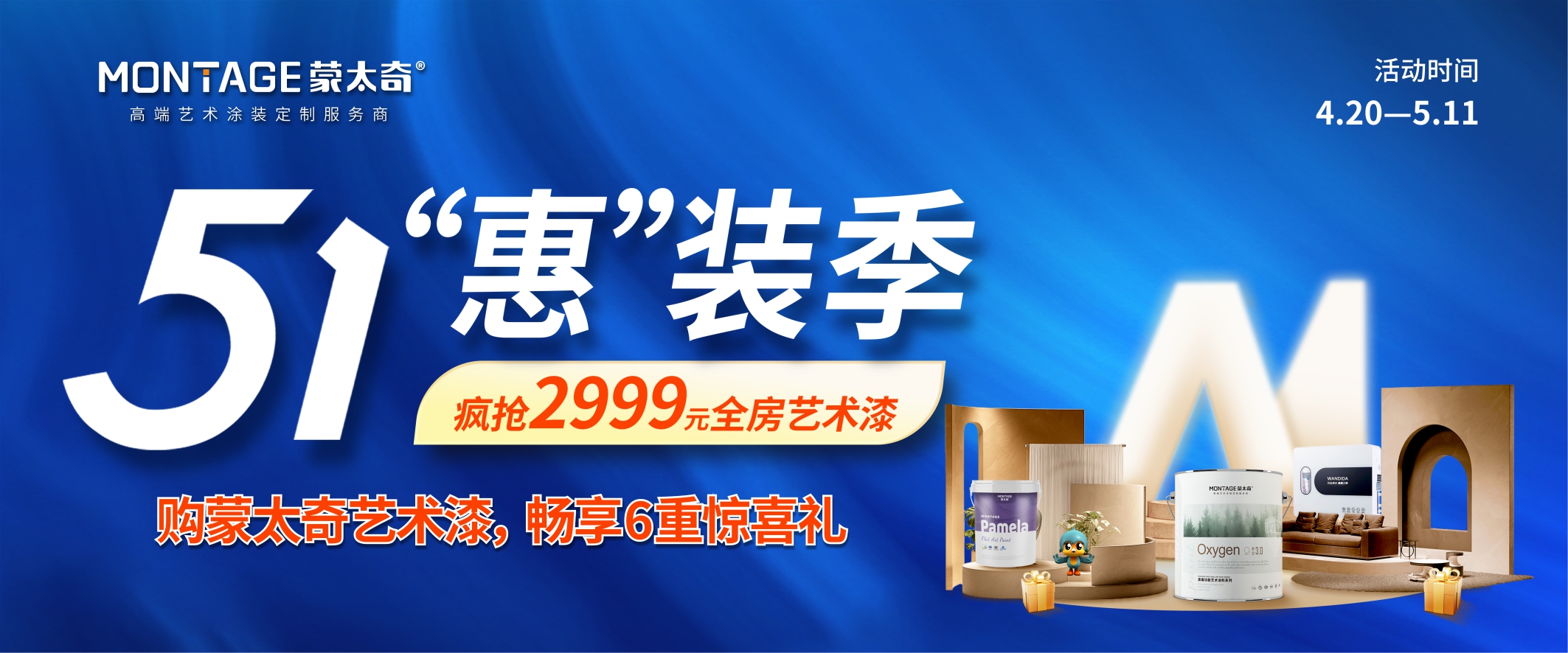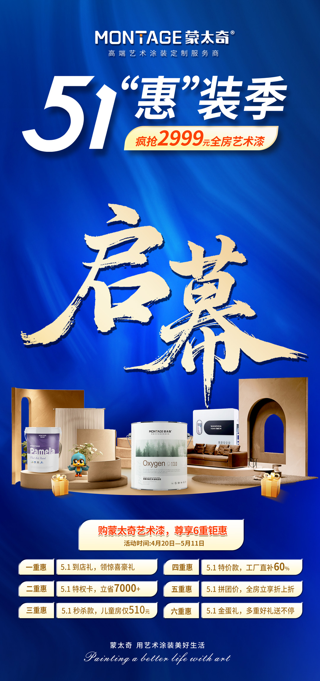 藝術涂裝正當時!蒙太奇51“惠”裝季全國大促今日正式啟幕,持續至5月11日,總部聯動全國門店推出6重驚喜福利,助您輕松打造高品質美家。