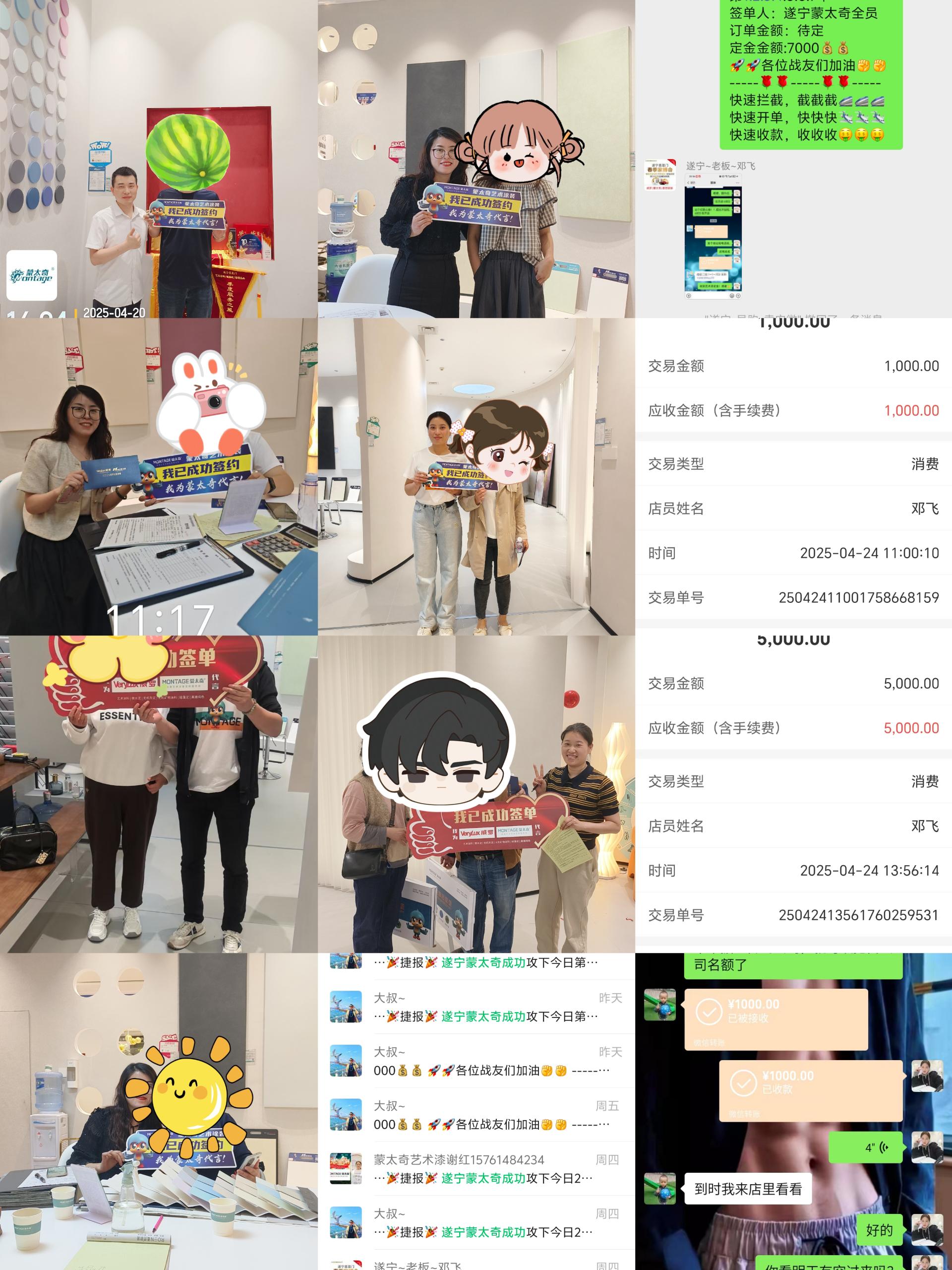 活動期間,蒙太奇主動營銷團隊深入終端一線,通過駐店開展單店爆破活動,系統實施小區業主群精準營銷、微信社群深度爆破、肄業聯盟交流會等核心舉措。各門店都積極響應,以高效執行力和專業服務贏得消費者贊譽。每一份捷報頻傳,每一次專業幫扶、每一句真摯感謝,都是對蒙太奇總部幫扶團隊專業能力與服務品質的更好見證。
