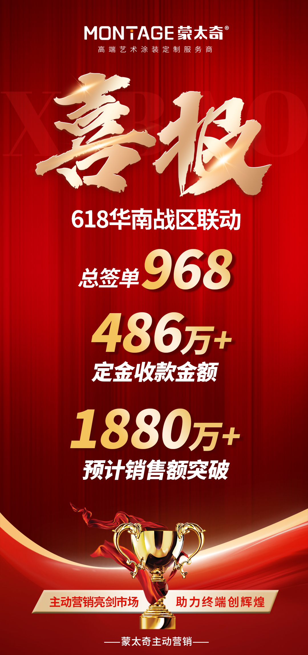 6 月 1 日至 22 日,蒙太奇 618 藝術涂料廠購節華南戰區聯動活動圓滿落下帷幕。活動期間,華南戰區各終端門店協同發力,累計成交968單,定金收款總額突破486萬元,以強勁的市場表現為這個火熱的 618活動 畫上了圓滿的句號,充分印證了總部戰略賦能與終端高效執行協同體系的強大力量。