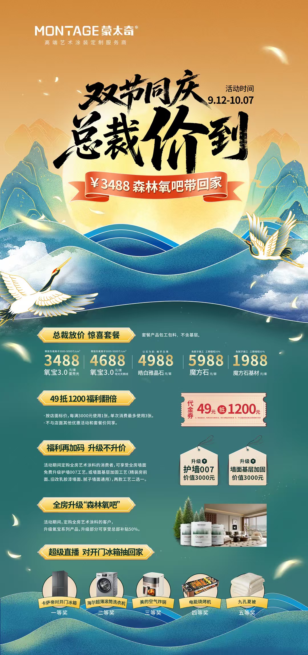 金秋送爽,雙節同慶。當中秋明月邂逅國慶華誕,9月12日至10月7日,蒙太奇藝術漆“雙節同慶,總裁'價'到”大促活動火熱來襲!迎中秋、慶國慶,我們特別推出氧寶系列產品升級鉅惠,助您用超值預算打造綠色森林之家,讓團圓與美好在此相遇,輕松實現一站煥新家。