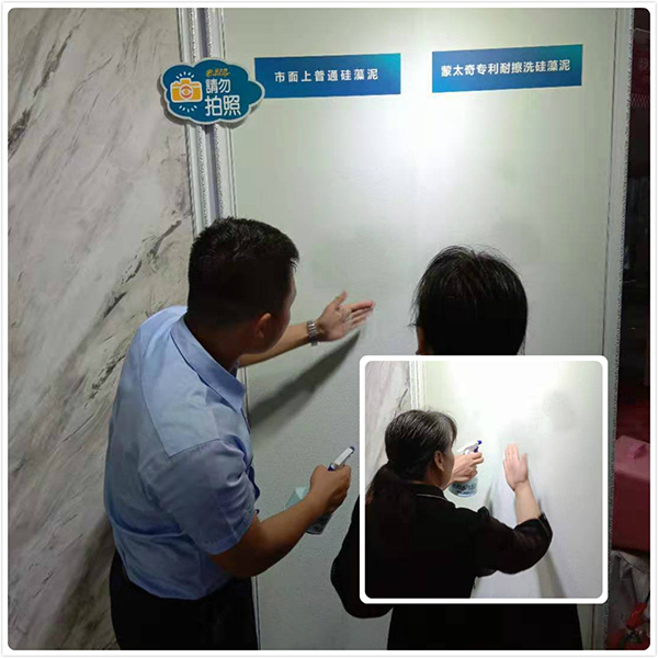 家博會現場,蒙太奇工作人員向消費者展示硅藻泥的耐擦洗性。為了增加消費者體驗度,更深入了解蒙太奇耐擦洗硅藻泥,消費者親自感受。不論墻壁濕潤還是干燥,擦洗過后的墻壁毫無掉色、掉粉的現象,這讓圍觀消費者紛紛點贊,駐足咨詢?,F場也因次火爆了起來。
