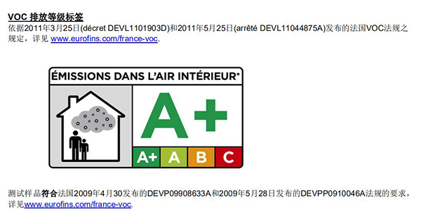 A+是法國VOC標簽中環(huán)保等級較高的標志。émissions dans l'air intérieur,英語對應為 Emissions in indoor air,漢語為“室內(nèi)空氣中排放物”。