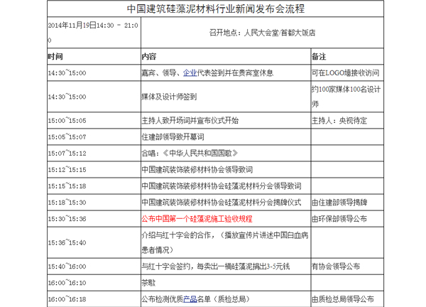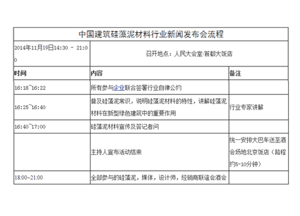 ? ? 在住房和城鄉建設部、環境保護部的指導下,中國建筑裝飾裝修材料協會硅藻泥材料分會定于2014年11月19日14:30到21點在人民大會堂召開“中國建筑硅藻泥材料行業新聞發布會”。